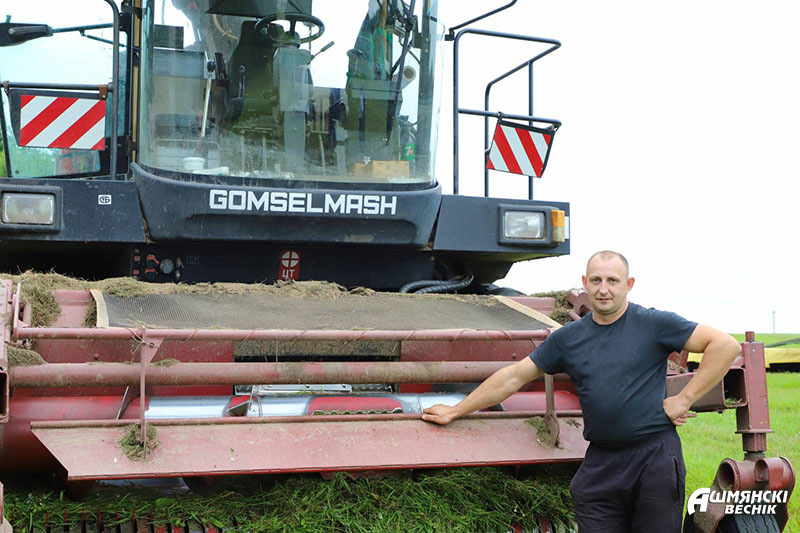 Упэўнена кіруе корманарыхтоўчым камбайнам Аляксей Тарасевіч, для якога сёлета шостая касавіца. За дзень, адзначае механізатар, атрымліваецца нарыхтаваць 350 — 400 тон травяных кармоў.