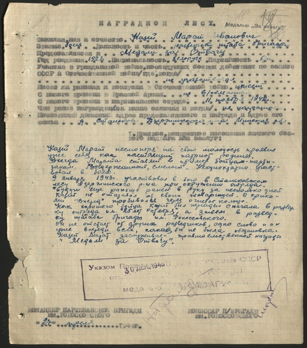 Судьба Марата была трагической. Отказавшись эвакуироваться с сестрой, Марат остался в отряде и продолжил воевать вместе со старшими товарищами. Бесстрашный и сильный паренек вызывал восхищение даже у бывалых солдат. Вскоре молодой боец вступил в ряды 200-й партизанской бригады имени маршала Рокоссовского, где служил разведчиком. Казей выходил в рейды и устраивал диверсии, вырывался из вражеского окружения и приводил помощь захваченным партизанам. Советское командование оценило преданность и смелость мальчика, наградив его почетной медалью «За отвагу» и орденом Отечественной войны.