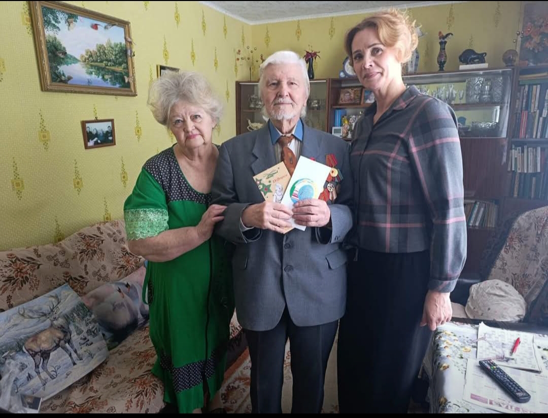 Бухгалтер районной профсоюзной организации работников АПК Оксана Людкевич и секретарь районного совета ветеранов Галина Яшина вручили цветы и подарки, пожелали здоровья, долголетия и мирного неба.