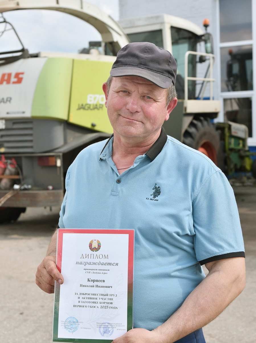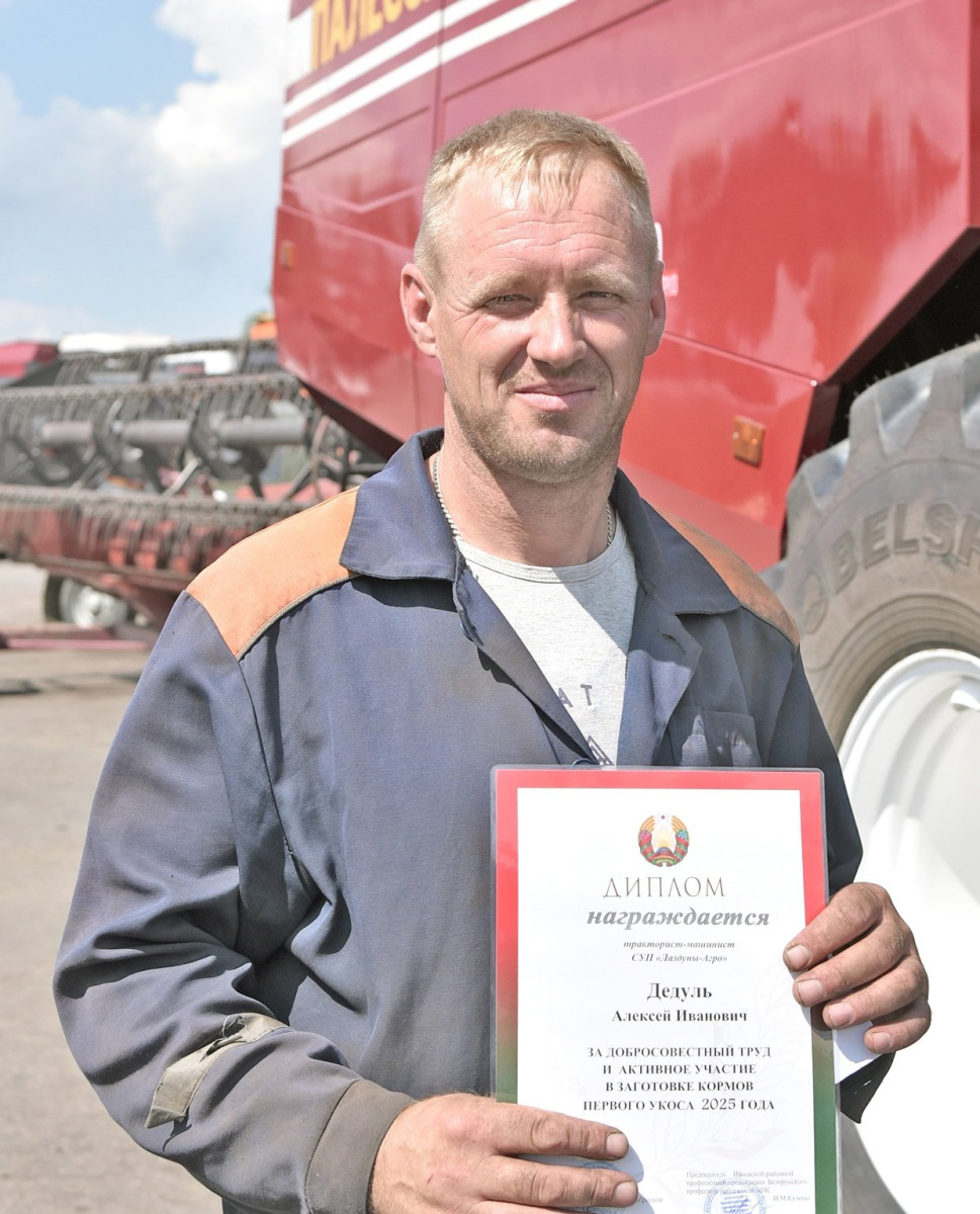 По результатам заготовки кормов из трав первого укоса в число лучших работников хозяйств района вошли трактористы-машинисты: Иван Андрукевич и Валерий Минко (КСУП "Баума"); Виктор Сокол и Владимир Лопата (КСУП "Субботники"); Алексей Дедуль, Иван Касперович, Николай Корнеев, Дмитрий Костюк (СУП "Лаздуны-Агро") и Владимир Мингинович (КСУП "Трабы"). Все они награждены Дипломом от Ивьевской районной профсоюзной организации Белорусского профсоюза работников АПК за добросовестный труд и активное участие в заготовке кормов первого укоса 2025 года а также денежными премиями.