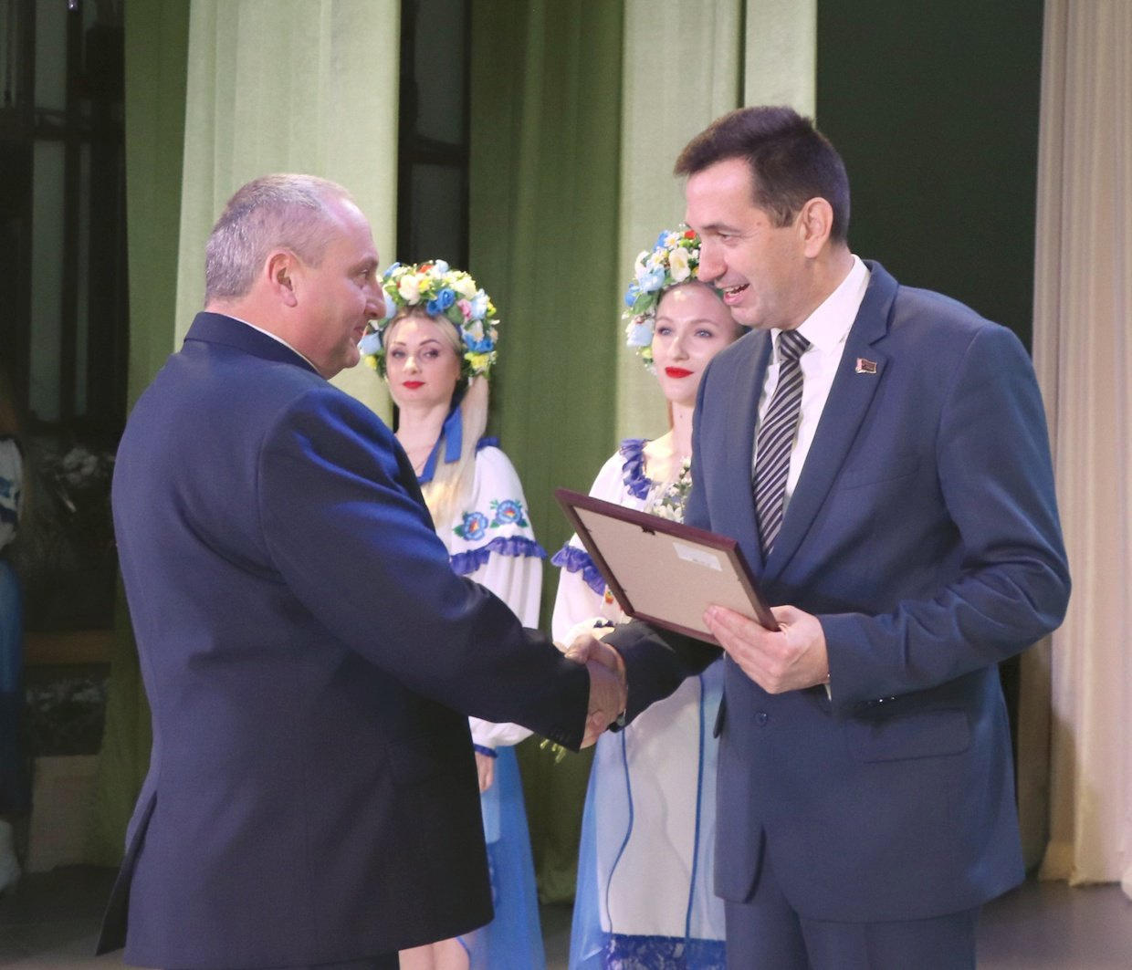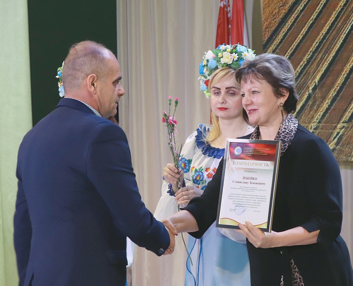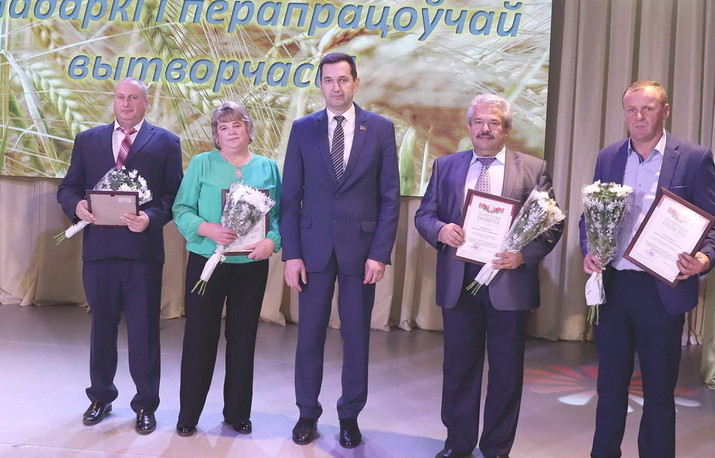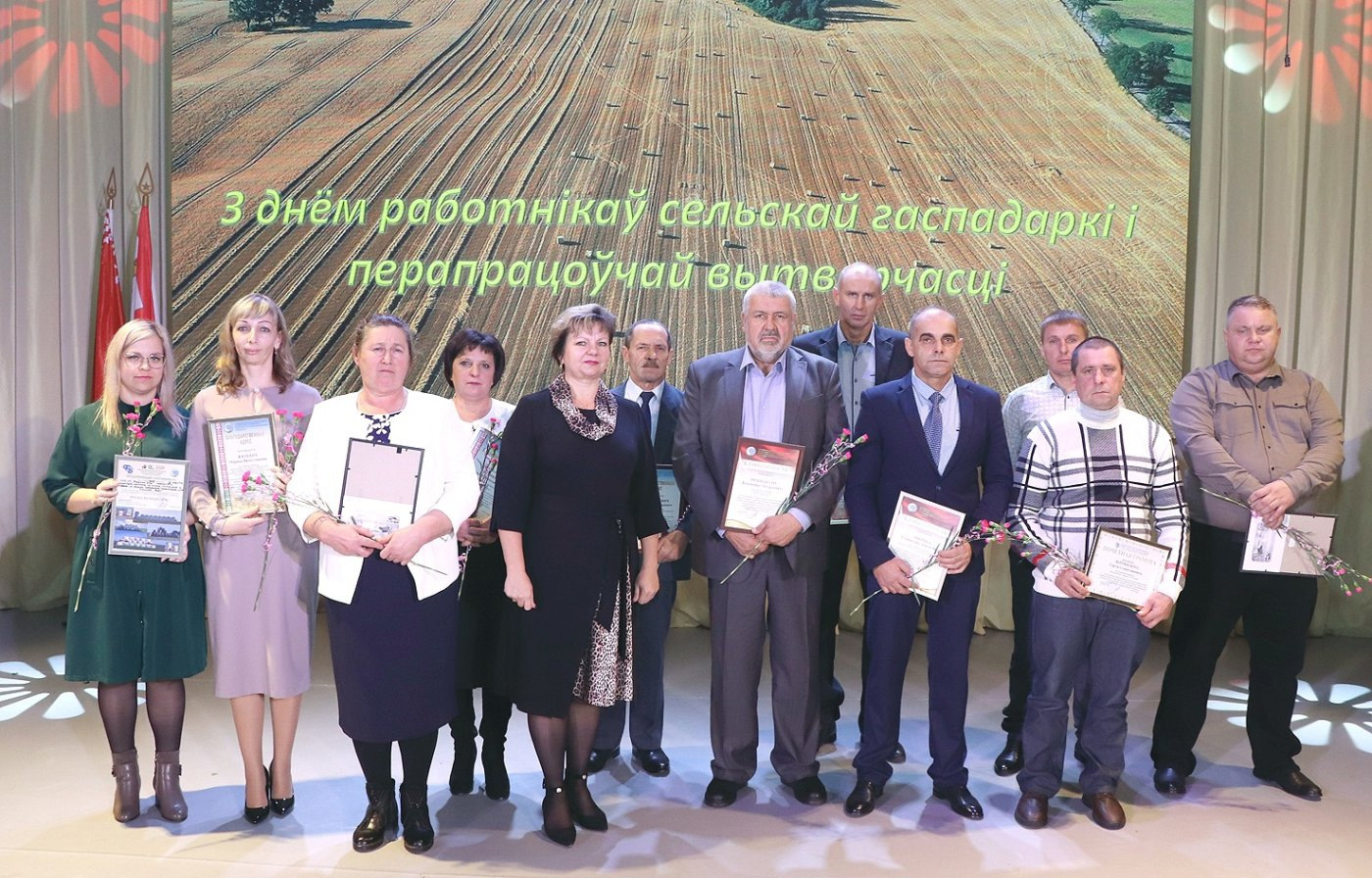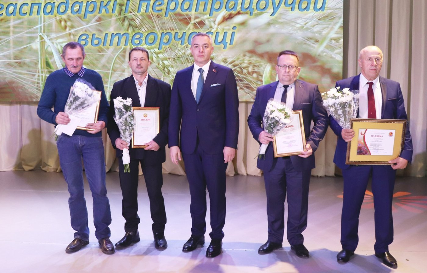 В преддверии профессионального праздника аграриев принято отмечать достижения всех тех, кто прилагает руку и способствует получению высоких урожаев, обеспечивает страну продуктами питания, занимаясь ежедневно нелегким трудом, находя в этом благородном занятии свое призвание. Торжественное мероприятие “Белорусы мы!”, которое прошло в райцентре, еще раз подчеркнуло важность хлеборобского труда. Не зря говорят: “Хлеб всему голова! - В доме. в поле, в державе!”. Началось торжество с вручения караваев из зерна урожая 2024 года председателю Ивьевского райисполкома Игорю Генцу, который поблагодарил работников отрасли за неустанный труд, высокую ответственность и добросовестное отношение к труду. В частности он отметил, что аграрии Ивьевского района в 2024 году достигли многого. - Именно в Год качества в деятельности наших хозяйств стало часто звучать слово "впервые". Впервые предприятия района намолотили 70 тысяч тонн зерна с учетом кукурузы. Впервые была достигнута продуктивность молочного стада в 5 тонн молока на корову. Впервые вес районного каравая в общей копилке области составил более 3%. И на достигнутом мы не остановимся, продолжая покорять новые вершины добросовестным и честным трудом, - сказал Игорь Генец. За добросовестный труд в сфере сельского хозяйства Почетную грамоту Ивьевского райисполкома глава района вручил Александру Олехновичу, трактористу-машинисту КСУП «Трабы» и Георгию Филимону, заместителю директора по растениеводству СУП «Лаздуны-Агро», Благодарностью председателя райисполкома отмечены работники КСУП «Баума» - животновод Ирина Доменяко и главный зоотехник Виктор Дияк. Приехал поздравить ивьевских тружеников полей и ферм заместитель председателя Гродненского облисполкома Виталий Невера: - У нас в стране очень много профессиональных праздников, но среди всех них у нас особое отношение именно ко Дню работников сельского хозяйства и перерабатывающей промышленности АПК. Это легко объяснимо - только, работая на земле, мы можем обеспечить свою безопасность и сохранить свою независимость. За последние годы Республика Беларусь входит в топ-10 по многим товарным позициям по продукции сельского хозяйства. Для Гродненской области результат производимой продукции в сельском хозяйстве в 4% обеспечивает количество экспортных поставок продовольствия на внешние рынки на сумму в 2 миллиарда. Это ваш вклад в формирование независимости нашей страны. Именно поэтому и отношение к труженикам села особое, ведь каждый день вы отдаете частицу себя на благо нашего государства. Виталий Невера вручил Благодарность председателя Гродненского облисполкома Станиславу Патуку, трактористу-машинисту СУП «Лаздуны-Агро». Почетным Дипломом комитета по сельскому хозяйству и продовольствию Гродненского облисполкома и денежной премией за II место в областном соревновании за достижение высоких показателей в отрасли животноводства среди районных ветеринарных станций награждена Ивьевская районная ветеринарная станция (начальник Виктор Дедуль). Почетным Дипломом комитета по сельскому хозяйству и продовольствию Гродненского облисполкома и денежной премией награждены победители областного соревнования по заготовке травяных кормов - Виктор Сокол, тракторист-машинист КСУП «Субботники» и Вячеслав Красновицкий, водитель С