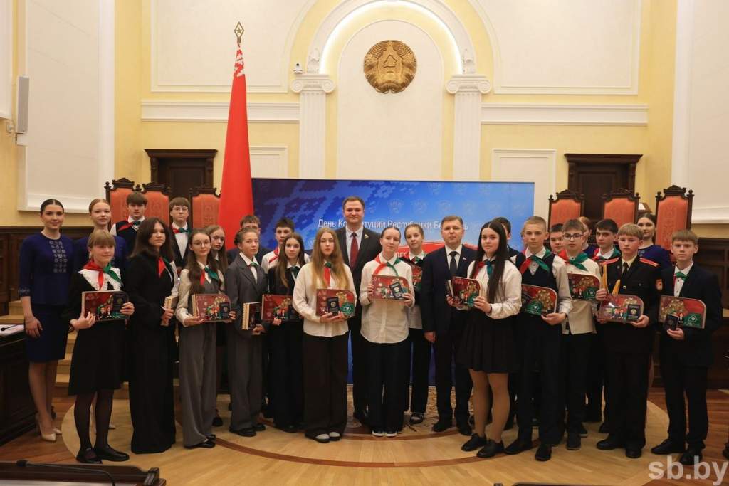 Паспорт гражданина Беларуси молодым людям вручили Председатель Конституционного Суда Сергей Сивец и первый секретарь Центрального комитета БРСМ Владимир Павловский. Вместе с главным документом ребята получили и подарки – брендированный бокс с Конституцией и Государственным флагом Беларуси, а также настольную деревянную карту из элементов, выполненных в форме территориальных единиц нашей страны.