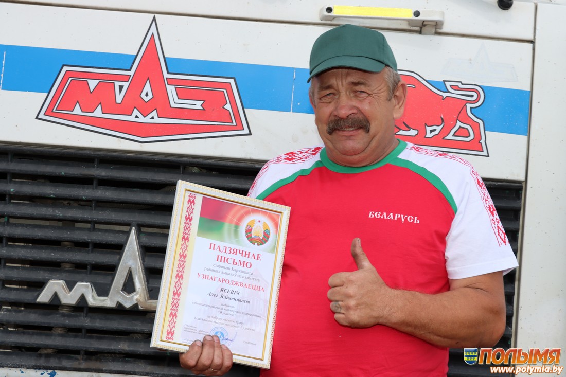 Заветный рубеж в тысячу тонн хлеба, перевезенного по маршруту поле-зерносушильный комплекс, первым в районе преодолел водитель СПК «Жуховичи» Олег Климентьевич Ясевич. Поздравления первый тысячник принимал прямо на рабочем месте. Со словами благодарности приехали председатель Кореличского райисполкома Геннадий Шатуев, начальник управления сельского хозяйства и продовольствия райисполкома Евгений Бусько, председатель Кореличского райкома профсоюза работников АПК Ирина Пеньковская и председатель СПК «Жуховичи» Дмитрий Янковский.