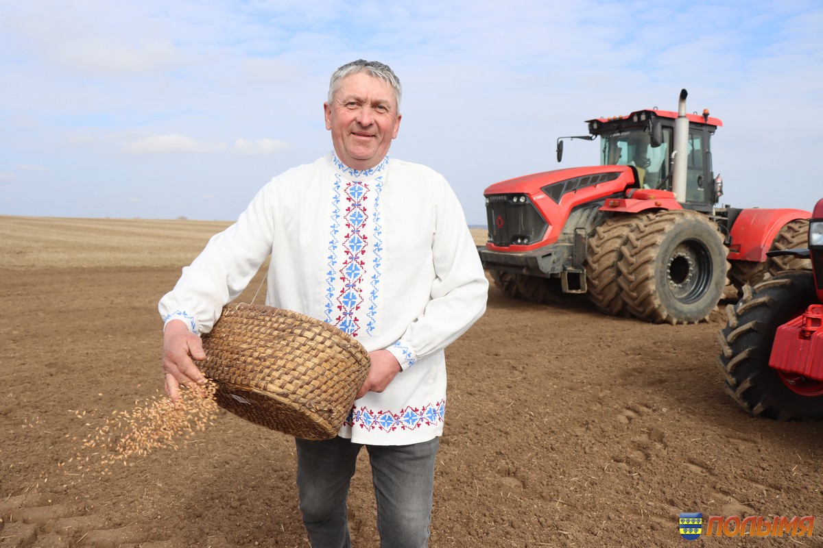 Затем председатель сельхозкооператива Юрий Леонтьев и заведующий участком Михаил Качан, одевшись в белорусские традиционные рубашки, с плетеными корзинами, наполненными зерном, трижды обошли трактора и бросили семена в землю.