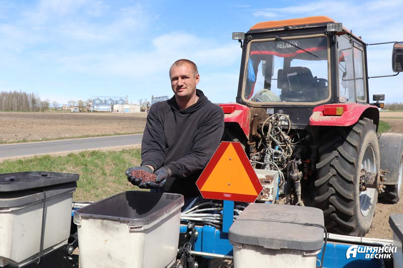 На севе кукурузы заняты два опытных механизатора — Александр Сосновский и Виктор Лежневич. Александр Сосновский уверенно ведет свой МТЗ-1025 с восьмирядковой сеялкой. Она захватывает клин в 5,6 метра. У Виктора Лежневича машина помощнее — МТЗ-1523 с сеялкой, которая захватывает 8,4 метра.