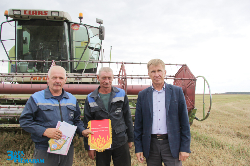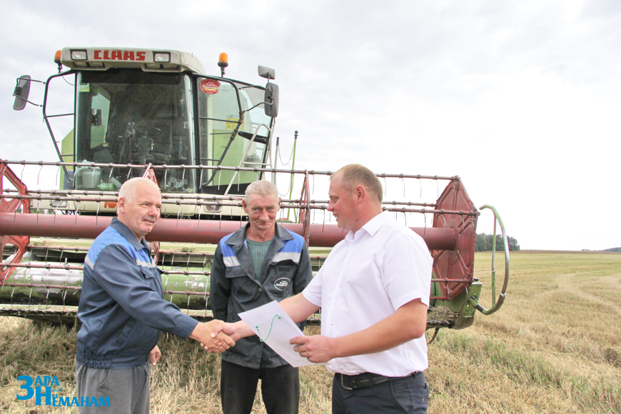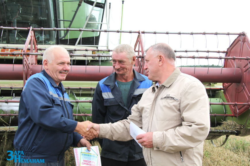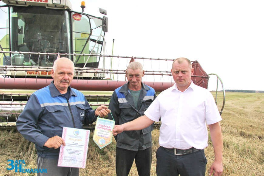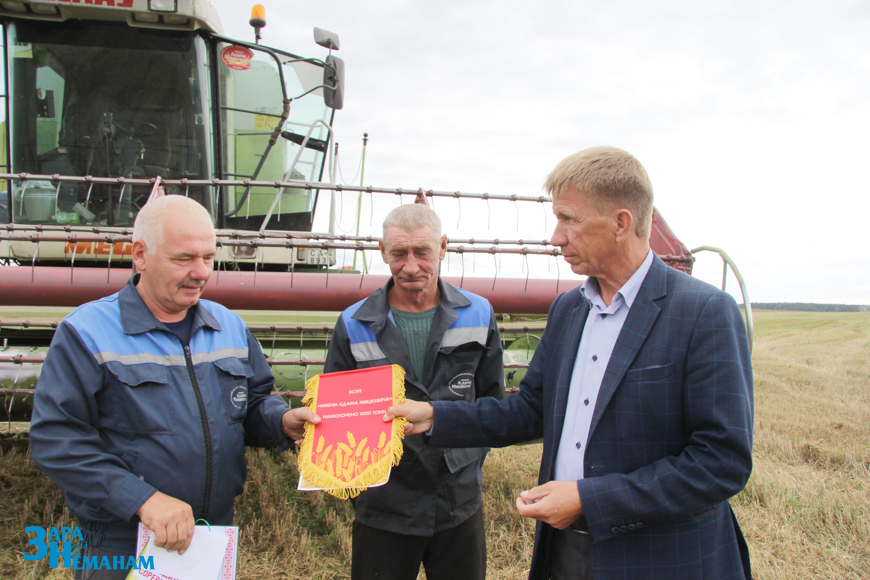 На этот раз в КСУП «Имени Адама Мицкевича приехали первый заместитель начальника управления сельского хозяйства и продовольствия – начальник отдела растениеводства Павел Велепольский и председатель районной профсоюзной организации работников АПК Виктор Метлюк. Они поблагодарили комбайнера Геннадия Мандика за труд, добросовестное отношение к технике и достигнутый высокий результат, вручили ему диплом и денежную премию, как победителю районного соревнования.