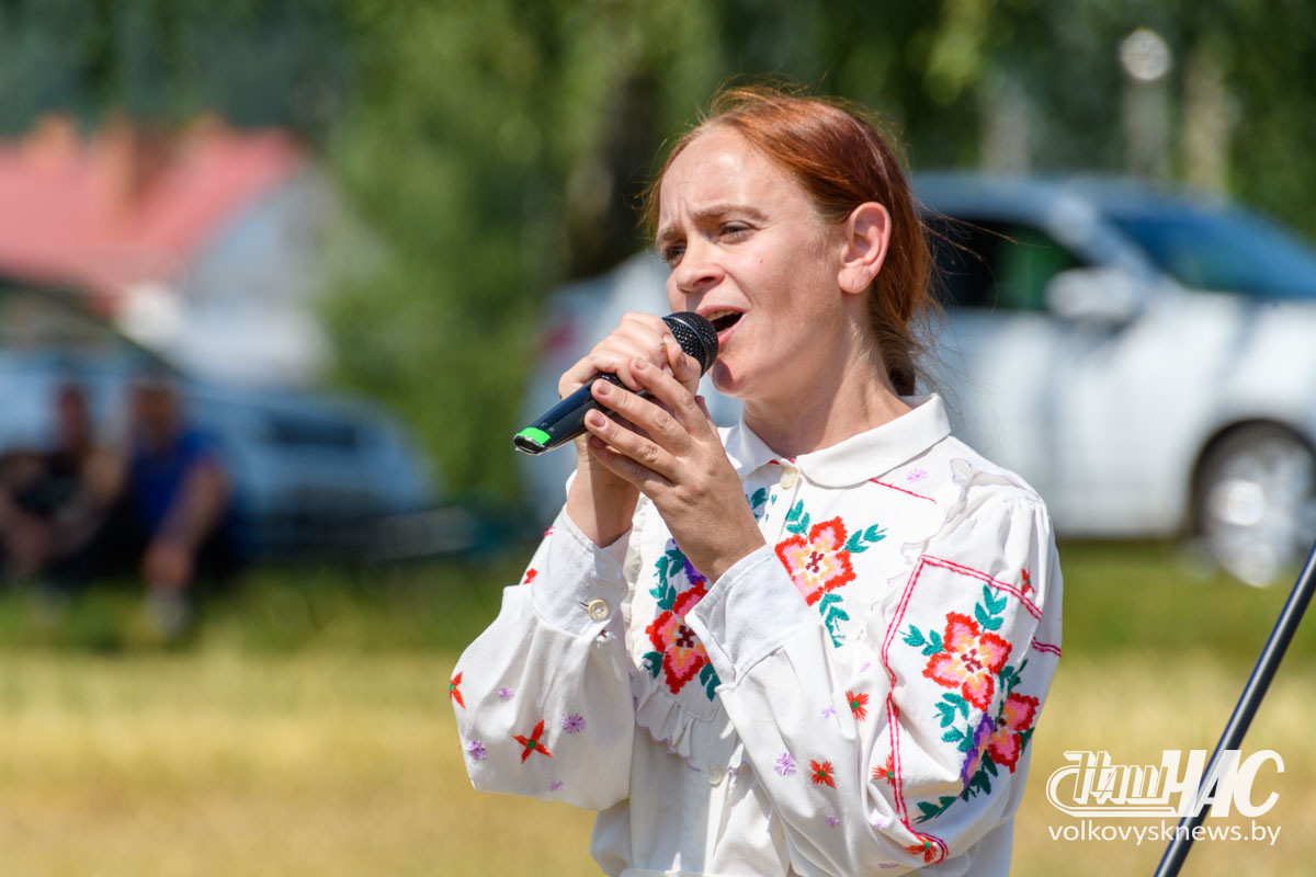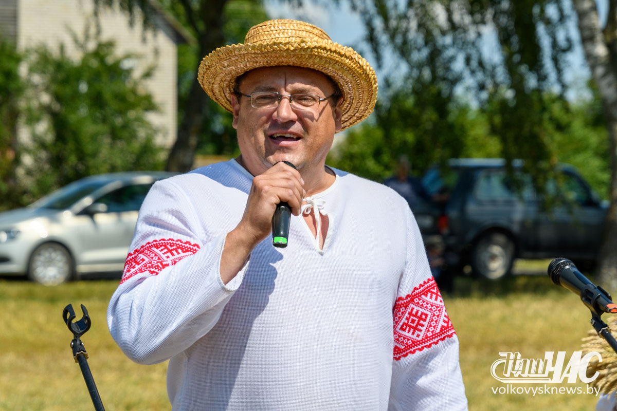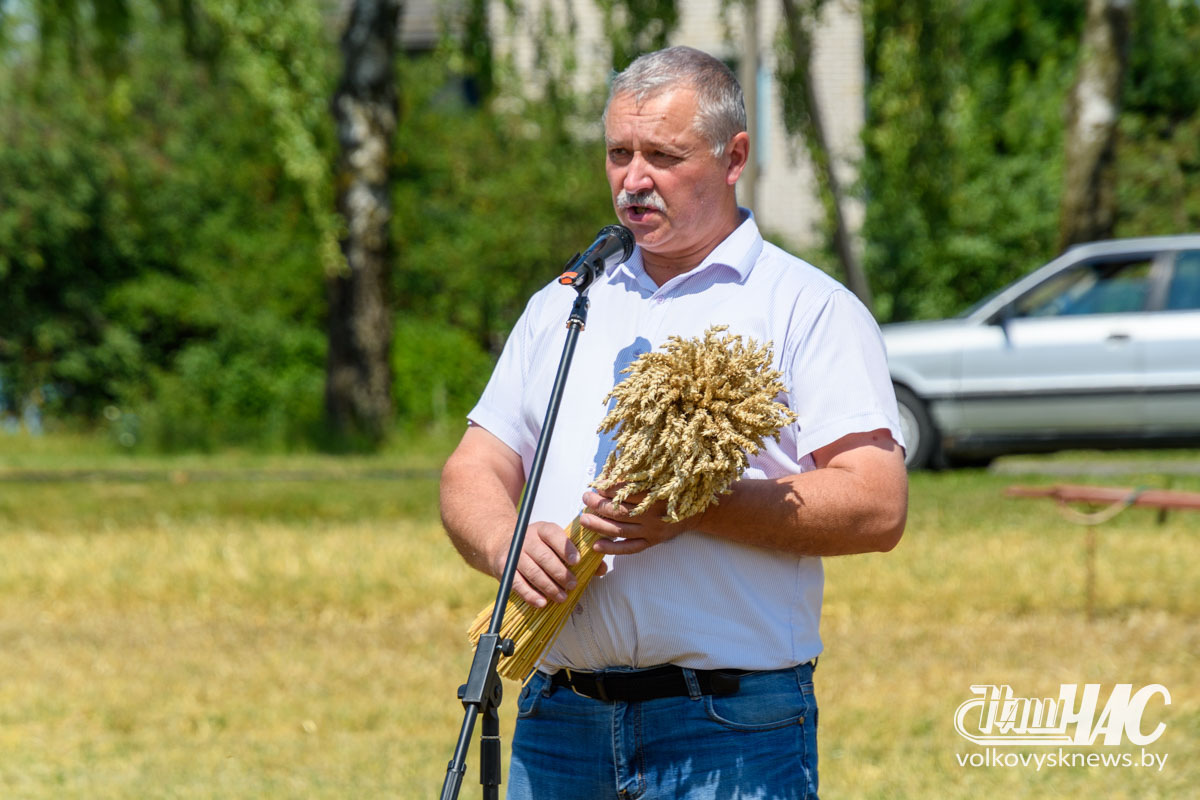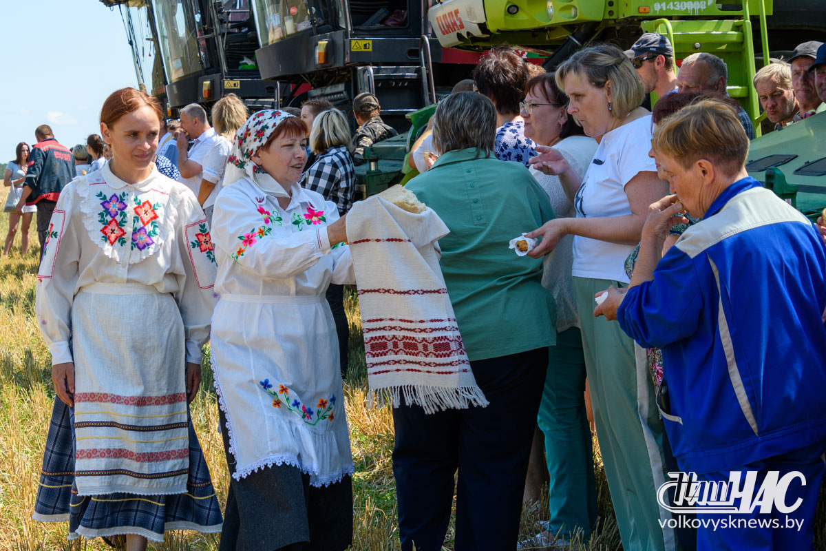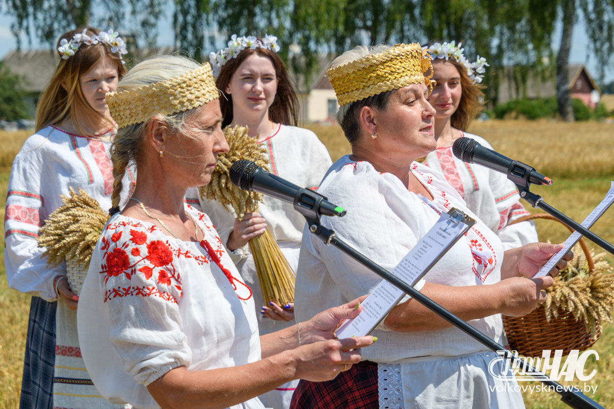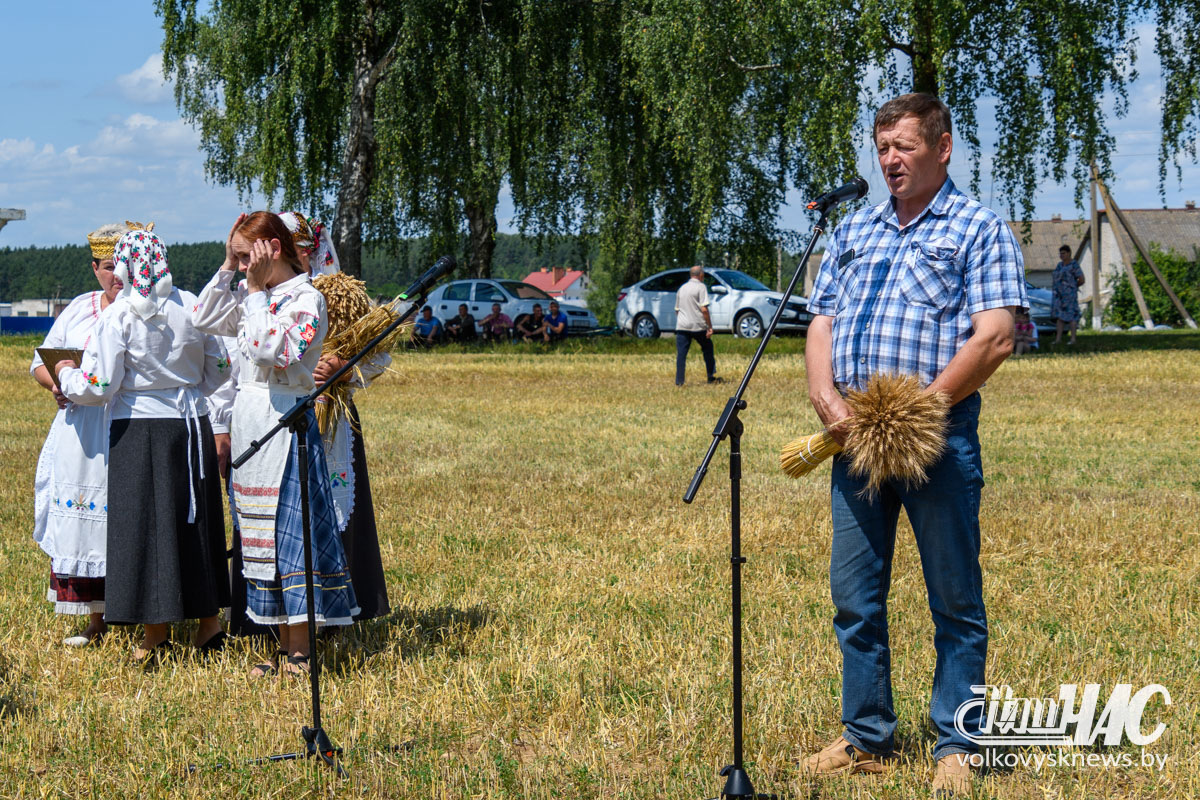 Две жнеи сжали колосья серпами, собрав их в один сноп. Первый. Самый важный. Когда-то этот сноп называли «гаспадаром». А сейчас вручают его «гаспадару», то есть — руководителю хозяйства. Все действия сопровождали народные песни, стихи.