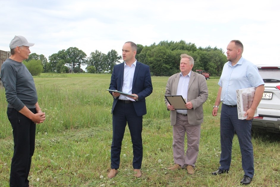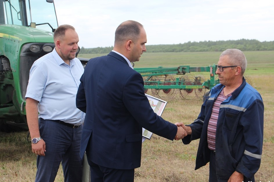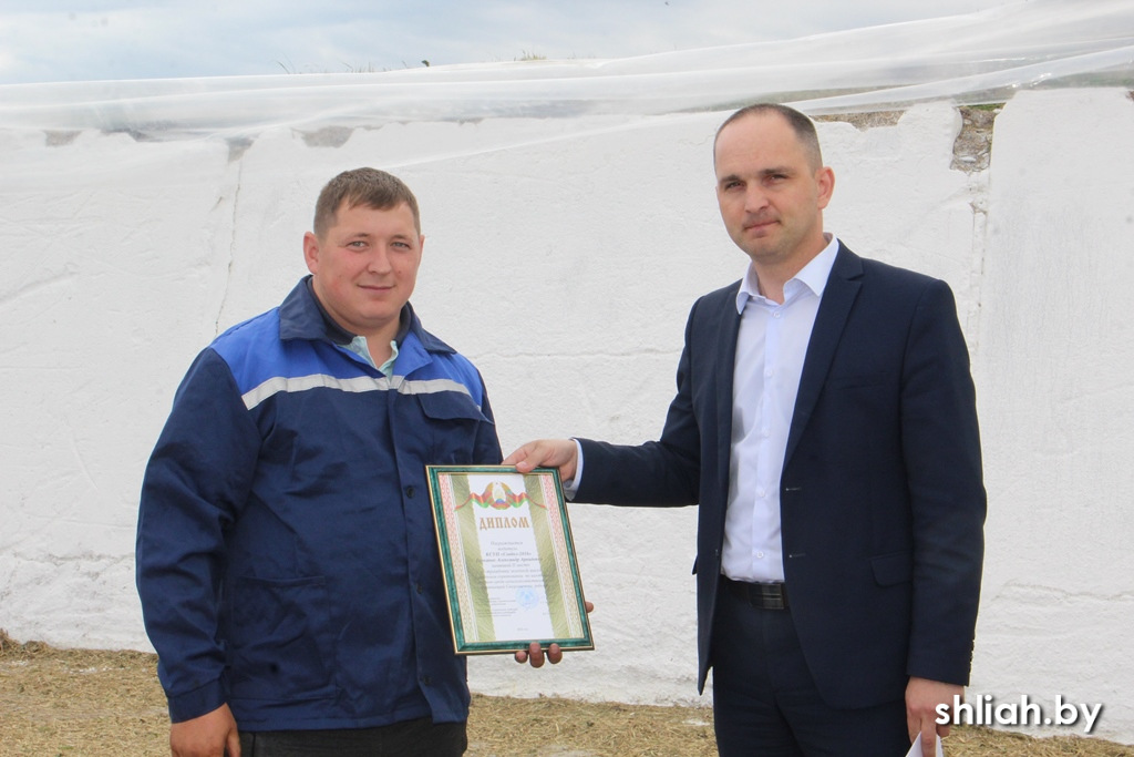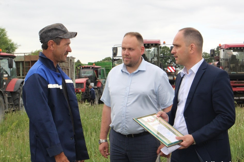 Первый заместитель председателя райисполкома – начальник управления сельского хозяйства и продовольствия Сергей Медзвецкас, профсоюзный лидер аграриев Сморгонского района Виталий Ивашко и директор КСУП «Совбел 2016» Марк Новик поздравили лидеров кормозаготовки, вручили им дипломы и подарки.