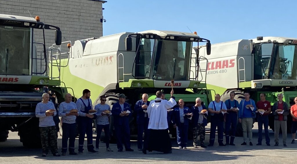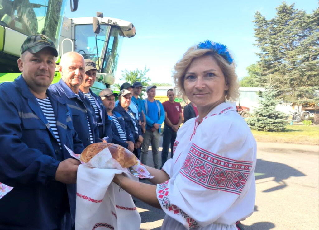Прозвучали обрядовые песни и слова пожелания здоровья, отличных намолотов и уборки без поломок и происшествий от директора сельхозпредприятия Юрия Яремича и председателя Берестовицкого райкома профсоюза работников агропромышленного комплекса Владимира Онищика.