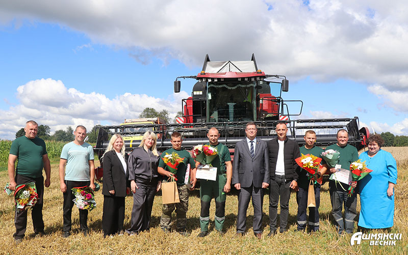 Первый заместитель председателя Ошмянского райисполкома – начальник райсельхозпрода Андрей Янюк вместе с председателем райкома профсоюза работников АПК Раисой Турлай выезжают в хозяйства, чтобы выразить механизаторам благодарность за труд и достигнутые успехи. К поздравлениям присоединяются руководители и председатели профсоюзных первичных организаций хозяйств. Дипломы, подарочные сертификаты, цветы и подарки вместе с теплыми словами благодарности механизаторы принимают с признательностью и достоинством — их труд отмечен – и с новыми силами спешат к своим машинам. Жатва в районе идет активными темпами, не за горами – и двухтысячные намолоты.