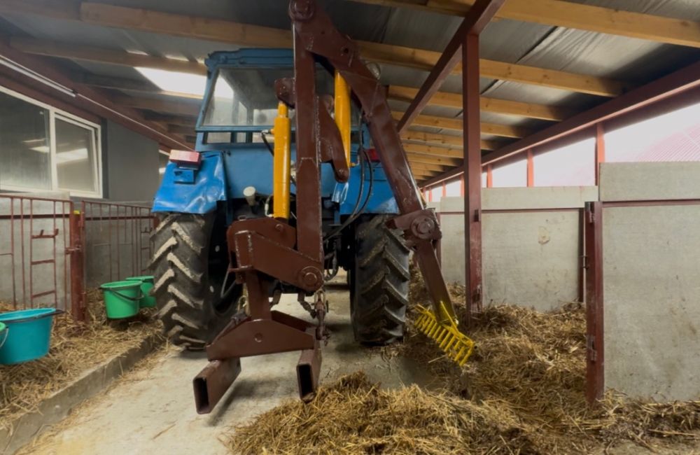 Разработка и изготовление заняла несколько недель. К трактору присоединили агрегат, в конструкции которого использованы цилиндры, шланги, пальцевые грабли. Приспособление показало свою эффективность во время первого его пуска. Клетка убирается за полторы-две минуты. Трактор с механизированным оборудованием подъезжает к ней и за два движения выталкивает навоз. Телятницам остается только подчистить, вымести и продизенфицировать клетку.