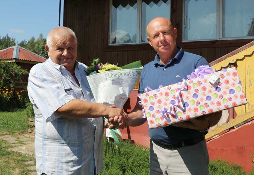 Павіншаваць яго са святам прыехалі старшыня раённага аб’яднання прафсаюзаў Аляксандр Дубовік і старшыня раённай арганізацыі Беларускага прафсаюза работнікаў аграпрамысловага комплексу Уладзімір Казак.