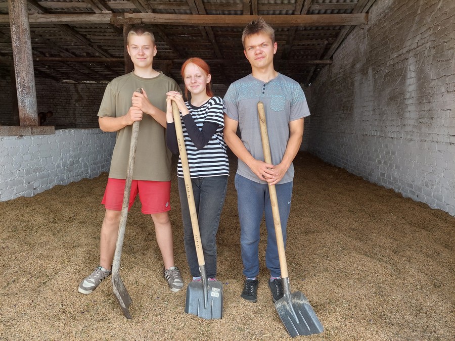 Евгений Шурмей, Анастасия Мартинкевич, Максим Булыга (слева направо) помогают хозяйству сушить зерно нового урожая.