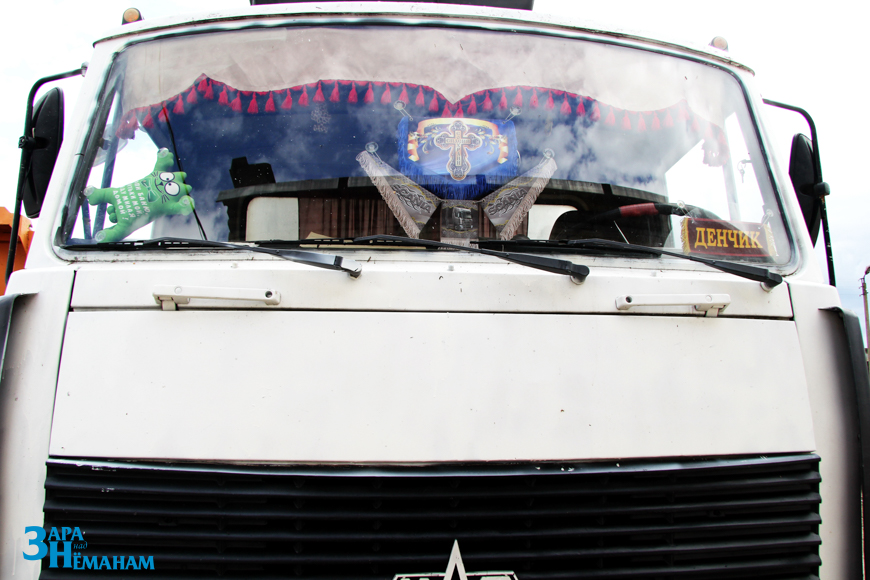 Приближается к этому результату и Денис Козакевич. Но вот только работает он на стареньком МАЗе-5551, который механизаторы называют «МАЗик Денчика». Такая шильдочка прикреплена к ветровому стеклу: «Денчик» означает Денис. Видели бы вы, как уютно и красиво у него в кабине.